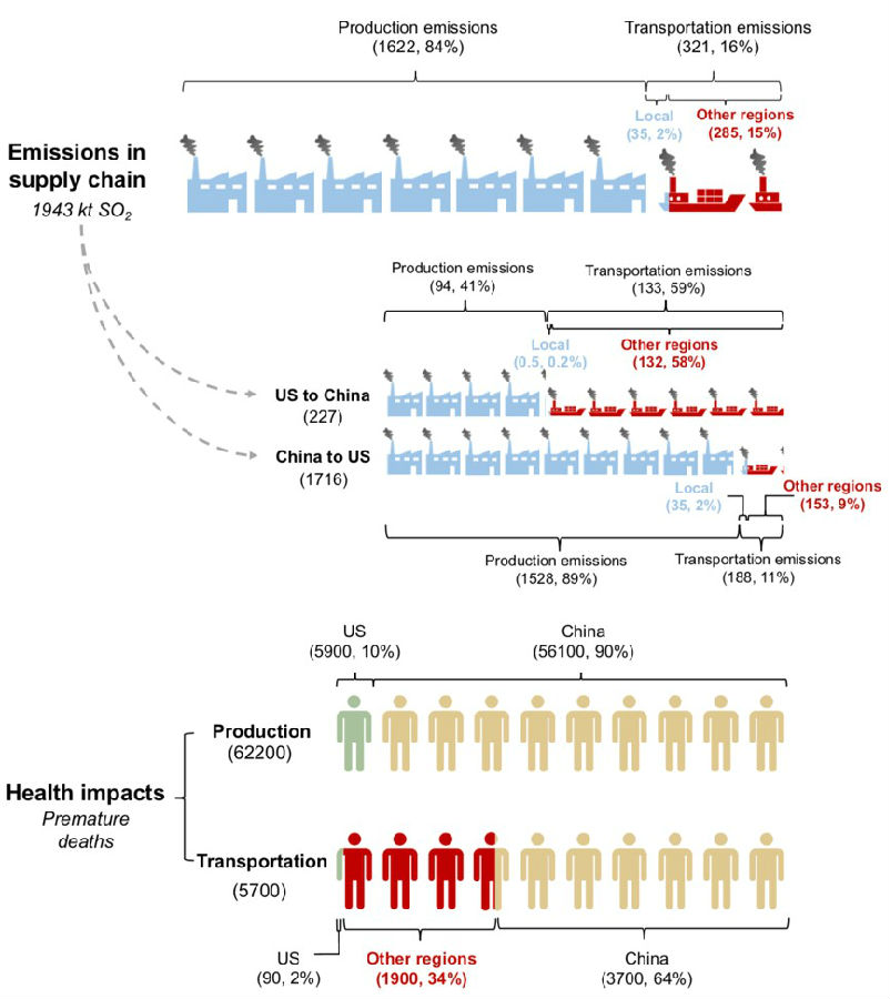图1 供应链视角下中美贸易隐含的航运排放和健康影响