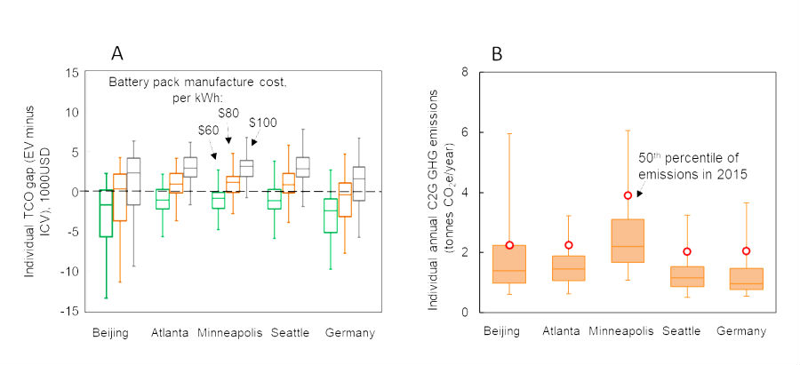图2:未来电池制造成本持续下降将使得更多BEV300车主获得总持有成本降低的经济效益(左);不同城市和不同个体间全生命周期温室气体排放分布差异显著(右)