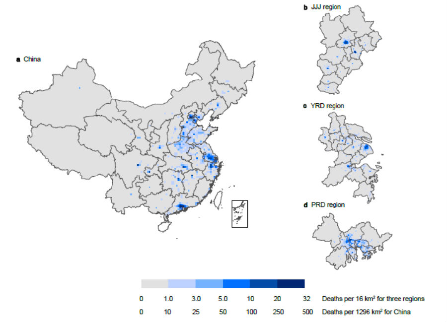 图2:电动汽车推广带来的健康效益主要集中在东部区域(左);三大城市群中健康效益主要集中在特大城市(如北京、上海和广州)市区(右)