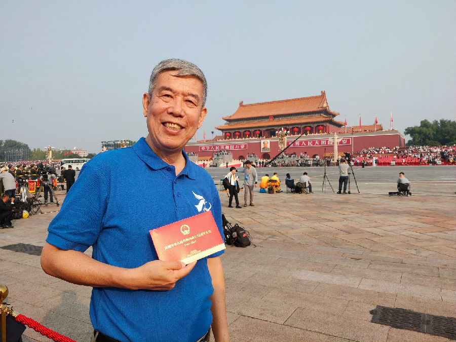 张晓健教授在观礼结束后激动地表示:‘红旗如海,欢声如雷,歌声嘹亮;阅兵方阵,铁流滚滚,威武雄壮;游行队伍,载歌载舞,激情奔放。此时此刻,此情此景,我激动,我自豪,我歌唱!回顾与展望,为了祖国的繁荣富强!我一直从事饮用水处理技术研究,为了保障人民饮水安全,我们团队十多年来研究建立了自来水厂应急净水技术体系,达到了国际领先水平,指导了全国供水行业的能力建设与供水安全保障,书写了属于这个时代的壮丽篇章。目前,我正在参与编制全国供水行业2035年技术进步发展规划,研究落实人民对美好生活饮用水的向往:从“有水喝”,到“喝好水”;从“合格水”,到“优质水”;从“放心水”,到“高品质水”……为了“全面建成小康社会”和“建设美丽中国”,我将贡献我的全部力量。新时代,新征程,让我们:不忘初心、牢记使命、继续奋斗,把我们亲爱的祖国,建设得更加繁荣富强!’