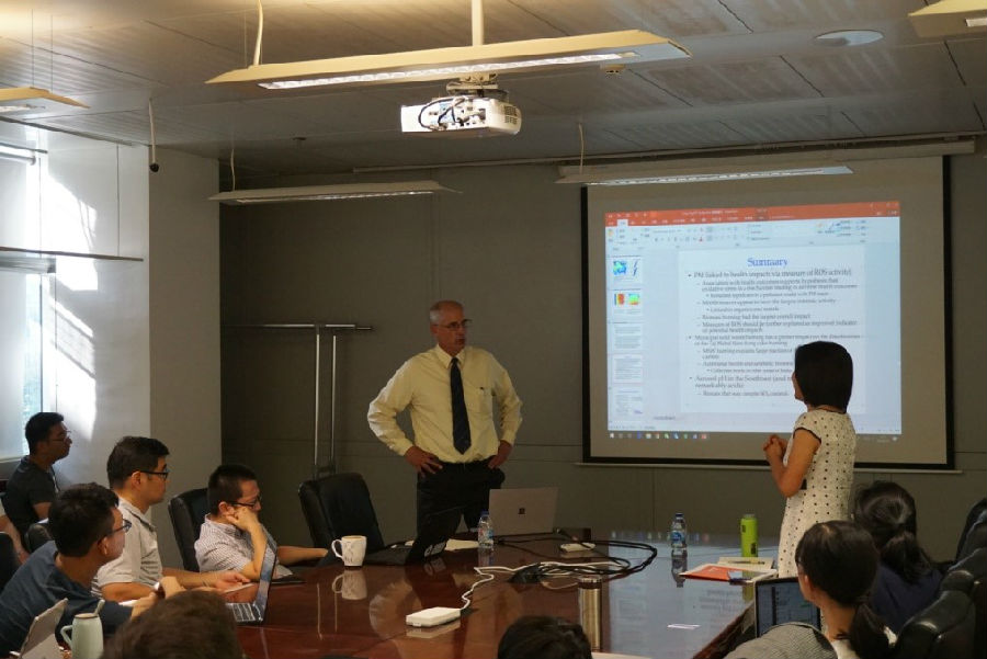 Russell教授首先简单介绍了目前对大气污染物诸如臭氧与PM2.5的形成认识,并阐述了其健康效应。随后,Russell教授逐一介绍目前诸多的研究进展。首先是水溶性PM2.5对活性氧物种生成的催化作用,通过将PM2.5与二硫苏糖醇(DTT)的反应活性、PM2.5浓度和健康效应进行统计学检验,发现PM2.5先通过催化形成活性氧物种,再损伤人体健康可能是PM2.5影响人类健康的主要方式,同时,研究发现由燃烧源产生的PM2.5的健康效应更大。此外,Russell教授又介绍了空气污染对泰姬陵建筑表面光泽的影响。研究指出,由于空气中大量的棕碳、黑碳等小颗粒的存在,使得泰姬陵表面吸附了大量的小颗粒,从而改变了建筑物表面光泽,进一步研究表明,该地区垃圾和粪便燃烧对该事件有较大的影响。最后,Russell教授介绍了关于大气颗粒物pH值的研究,研究表明现阶段大气颗粒物酸性较强,而对SO2排放的大幅削减可能由于NH3的缓冲作用,并不会带来颗粒物pH值的大幅上升。讲座结束后,在场师生踊跃提问,气氛热烈,与Russell教授进行了深入的沟通与交流。