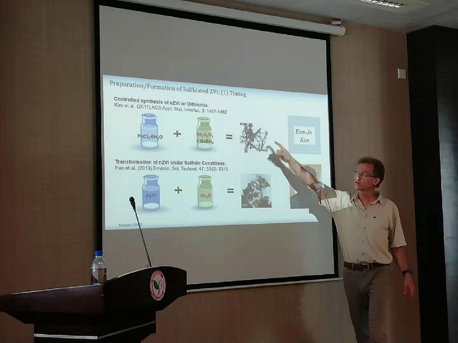 Tratnyek教授在报告中逐一介绍了关于硫化零价铁(S-ZVI)的研究进展。首先介绍了零价铁的发展史,进而引出含硫物质在零价铁发现过程中所起的作用,并指出零价铁硫化作用成为研究分支,使零价铁成为新的研究热潮。Tratnyek教授从材料特性,反应物和动力学、产品和选择性三个方面对S-ZVI进行详细介绍:①材料特性部分,介绍了S-ZVI材料的不同制备方法和结构特征差异;②反应物和动力学部分,结合具体案例,对S-ZVI与污染物的反应过程进行分析,包括反应速率和反应路径等方面;③产品和选择性部分,分析了S-ZVI与污染物反应后的产物特点,最后对该材料的商用价值进行了阐述。讲座结束后,在场师生踊跃提问,气氛热烈,与Tratnyek教授进行了深入的沟通与交流。