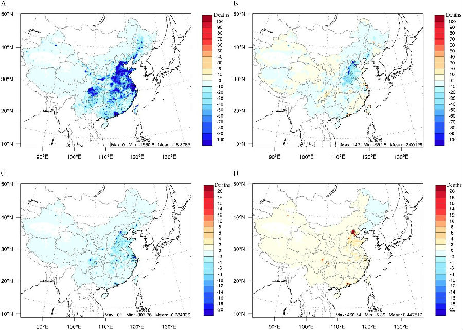 (A)人为源排放,(B)气象条件,(C)死亡率与(D)人口在2013与2017两年间的变化对早逝人数的影响(蓝色表示该因素变化带来了健康效益)