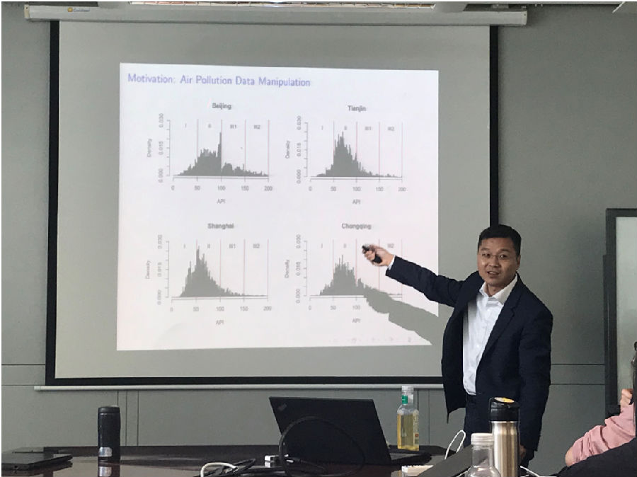 张俊杰教授首先介绍了环境数据操纵的研究背景,指出在经济、社会和环境等考核体系驱动下,地方官员有可能会出现操纵城市环境数据的行为。随后,张教授介绍了一种改进的计量经济学方法来估计被操纵环境数据所占的比例,并利用2000到2010年期间113个环境保护重点城市的空气污染数据,准确地估计了阈值附近的数据操纵程度。为了识别数据操纵程度的影响因素,张教授考察了城市层面的大量社会经济数据和城市管理者的个人特征数据,并运用了一种新的机器学习算法-LASSO。最终发现,在城市官员的众多背景特征中,市委书记的重点大学背景是影响环境数据质量的主要变量。最后,张教授从市委书记的个人能力、社会关系网络和理想抱负三个方面的特征分析了其对空气污染数据操纵的驱动力和影响。讲座结束后,在场师生踊跃提问,气氛热烈,与张俊杰教授进行了深入的沟通与交流。
