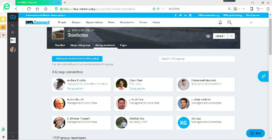 william威廉中文官网2019年4月16日电 近日,国际水协会(International Water Association, IWA)在其网站上公布了IWA消毒专业委员会新一届管理委员会(Management Committee of Disinfection Specialist Group) 的9位成员名单。william威廉中文官网陈超副研究员当选消毒专业委员会管理委员会主席,这是第一次由来自中国的专家担任该职务,也是继黄霞教授担任膜技术专业委员会主席之后,第二位担任IWA某专业委员会主席的公司教师。此前,陈超曾连续十多年担任国际水协会消毒专业委员会委员、秘书长。