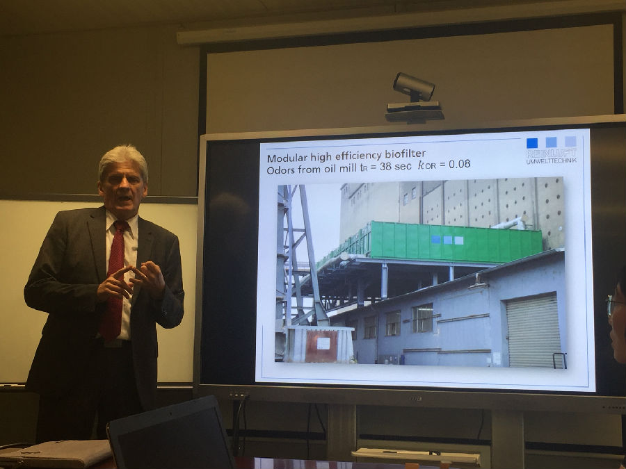 Sabo教授首先介绍了生物废气净化技术的理论基础,包括pH、温度、停留时间、生物活性等因子对生物净化的影响。随后,Sabo教授介绍了生物净化技术在实际应用中涉及到的计算及其他需求。最后,Sabo教授通过实际案例,介绍了废气生物净化技术在食品加工工业、汽车工业、涂装工业等不同行业的应用。讲座结束后,同学们就废气生物净化技术在实际应用中出现的相关问题与Sabo教授进行了热烈的学术讨论。