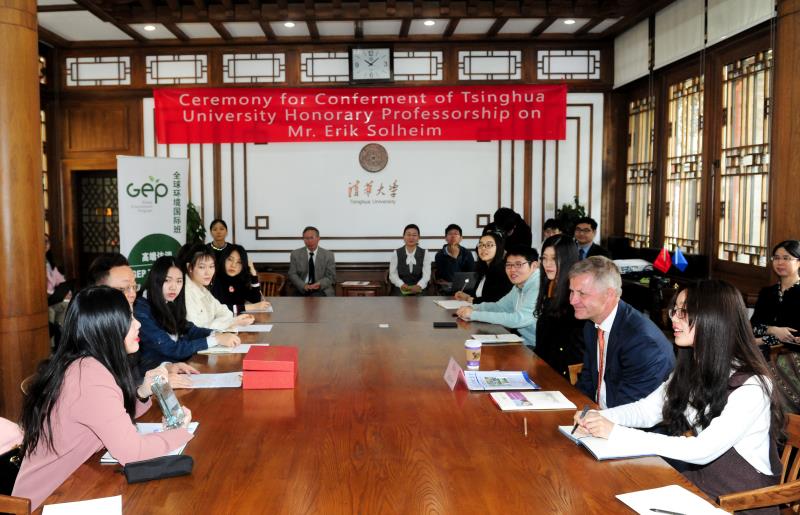 william威廉中文官网2018年4月18日电(通讯员 陈嘉珲 赵倩)2018年4月17日上午, 联合国环境规划署(UNEP) 执行主任埃里克·索尔海姆 (Erik Solheim)在williamhill英国官网工字厅做客国际班高端访谈。william威廉中文官网经理贺克斌、咨询教授李金惠、国际班项目主任鲁玺等工作组成员参加了本次访谈,这次访谈由GEP2016级卢炜媛同学主持。