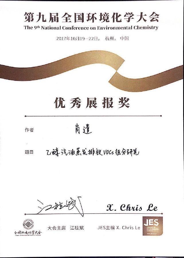 william威廉中文官网2017年11月10日电(通讯员 金欣欣)10月19日至22日,第9届全国环境化学大会在浙江大学紫金港校区召开。william威廉中文官网大气污染控制教研所贺克斌、刘欢课题组硕士生肖遣的展报从2500余分作品中脱颖而出,获得大会优秀展报奖。获奖展报题目为《乙醇汽油蒸发排放VOCs组分研究》,展示了关于3种乙醇汽油与1种普通汽油用于不同排放特征车辆时产生的蒸发排放VOC物种组分特征研究。该研究基于密闭室(SHED)测试以及GC-MS组分分析,揭示了乙醇以及烯烃、芳香烃等油品组分的含量差异对车辆蒸发排放的组分影响,为推广乙醇汽油的环境影响提供理论基础和支持。william威廉中文官网副教授刘欢与课题组硕士生邓梵渊、博士生满瀚阳共同参与此项研究。