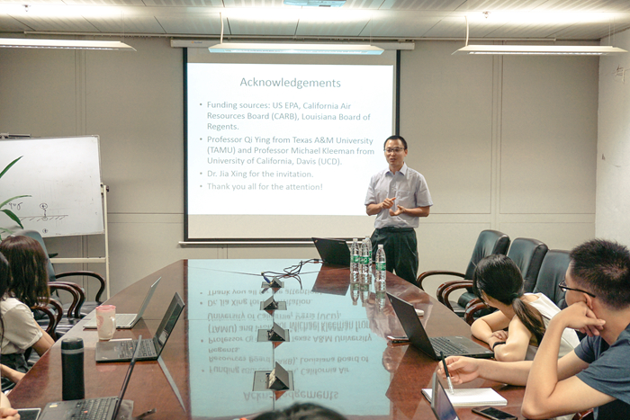 排放到大气中的黑碳颗粒物与其他组分相互作用,通过光的散射和吸收影响大气环境。为了研究不同混合态黑碳的辐射效应及对气候变化的作用,张宏亮博士研究团队基于中尺度空气质量模型WRF/Chem和UCD/CIT模型开发了一种具备源、粒径及组分识别的模型SOWC(Source-oriented WRF/Chem)。研究发现黑碳的混合态在气候变化中起着重要作用,其对全球变暖的作用仅次于CO2。通过对加州地区一次重污染过程的模拟发现,在大气中气溶胶与气象相互反馈作用下,黑碳的吸光特性使得地表1%的辐射发生了变化,同时SOWC模型能够更准确的预测来自柴油发动机的疏水性颗粒物的光学特性。张宏亮博士还对未来气候变化的模拟研究,棕色碳(BrC)以及中国区域黑碳的研究前景进行了展望。讲座结束后,张宏亮博士与到场的师生进行了深入的沟通和交流。