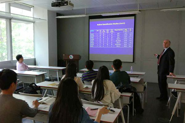Dionysiou教授在报告中主要介绍了基于硫酸根自由基的高级氧化技术(SR-AOPs)在饮用水及污水处理中的应用,包括硫酸根自由基的产生、激活、降解有关污染物(比如药物、杀虫剂、蓝藻毒素等)时的反应机理以及这一技术未来的发展潜力。Dionysiou教授从整体上展现了SR-AOPs技术全景,同时给出了许多应用细节,比如(1)通过光解、热解及过渡金属激活过硫酸盐来产生硫酸根自由基;(2)无机盐离子及天然有机物对基于紫外线激活的SR-AOPs降解抗生素的效率的影响;(3)SR-AOPs降解蓝藻毒素及药物时的降解机理,并与羟基自由基做了对比;(4)SR-AOPs技术中消毒副产物的形成;(5)硫酸根自由基在异相界面上的形成。Dionysiou教授在报告结束后与现场师生进行了深入的沟通与交流。