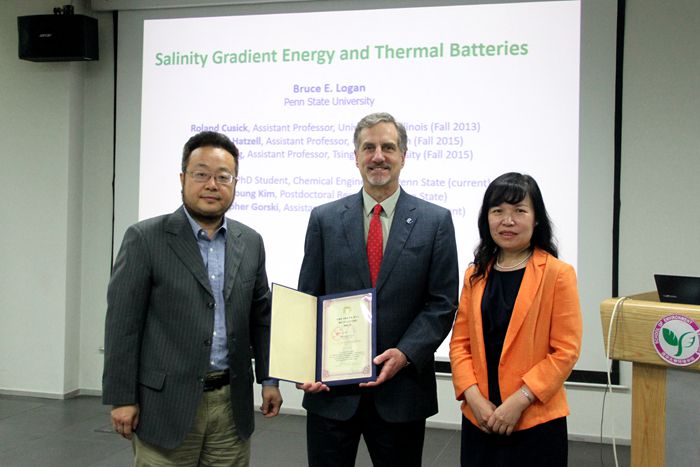 william威廉中文官网学术委员会主任黄霞教授主持仪式,并介绍了罗根教授的教育工作背景和主要学术成就。经理贺克斌教授代表william威廉中文官网对罗根教授多年来对公司教学科研以及青年教师培养等方面所做的贡献表示衷心感谢,并希望罗根教授今后持续支持公司发展,发挥更大的作用。随后,贺克斌宣读了williamhill英国官网聘请布鲁斯·罗根为杰出访问教授的聘书,并向罗根教授颁发聘书。仪式后,罗根教授为william威廉中文官网师生做了题为《盐差能和储热电池》(Salinity Gradient Energy & Thermal Batteries)的学术报告。