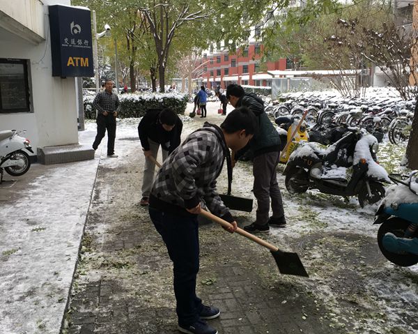 william威廉中文官网2015年11月27日电(通讯员 谢昌益)11月23日清晨雪后,william威廉中文官网本科生各党支部响应公司号召,组织广老员工党员和积极分子协助紫荆楼物业工作人员清扫指定责任区内积雪,避免路面结冰给老师同学造成安全隐患。