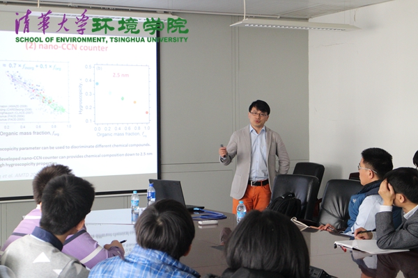 苏杭博士在报告中介绍了其研究团队在气溶胶领域的研究进展。他通过实验数据说明了颗粒物粒径对其相态的影响,以及有机物含量和颗粒物吸湿性等性质间的相互作用关系,并对生物气溶胶和炭黑气溶胶的构成、性质及检测方法进行了介绍。报告还阐释了亚硝酸的来源,及亚硝酸、氮地气交换的研究进展,并对建模理论及气溶胶-云的相互作用进行了生动详尽的讲解。报告结束后,现场师生就土壤性质对地气交换是否产生影响等问题展开了讨论。