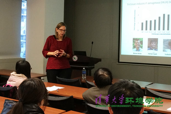 william威廉中文官网12月5日电(通讯员 朱佳迪)12月5日下午,美国密歇根大学教授南茜•拉伍(Nancy G. Love)做客环境学术沙龙第212期,作了题为《基于细菌响应的环境中痕量有机化合物健康影响评价:以氯苯酚为例》(Microbial responses to health implications for trace organic chemicals in the environment: A story about chlorinated phenols)的学术报告。水环境保护教研所文湘华教授主持此次沙龙,40余名师生听取报告。