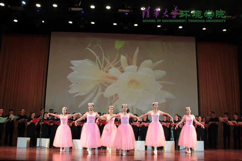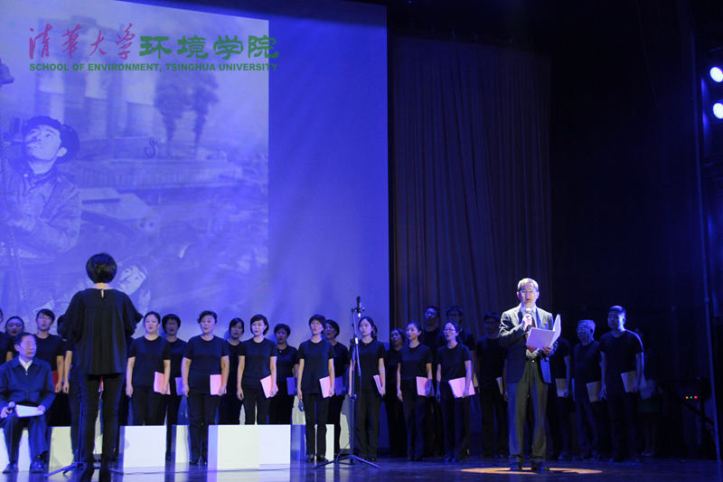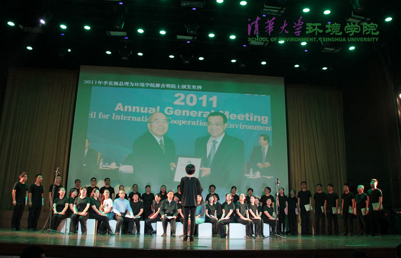图为第二部分小合唱,背景图为李克强总理为郝吉明院士颁奖 高晓娟 摄
