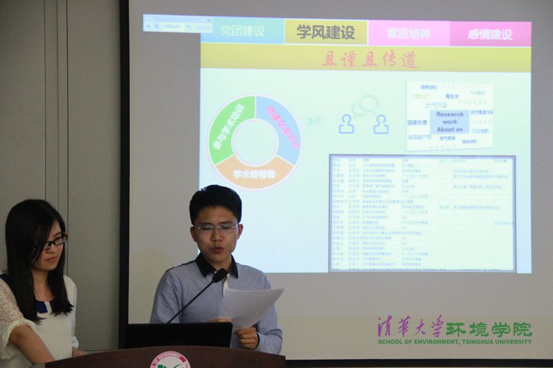 首先上台的是环博131班级,他们围绕着“梦在前方路在脚下”主题展示了班级风采。随后,环博132班的两位同学用饱含深情的语言,向现场展示了环博132“一声爱,一生爱”的班级风采。环硕131的主题简单明了——“一三一•家”,答辩同学从班级内发生的几件小事和对他的影响讲起,从科研、学术和感情建设几个方面介绍了班级风采。最后上场的是环硕132班,答辩分为“党团建设”“学风建设”“素质培养”“感情建设”四个方面进行展示,诙谐幽默的语言引起阵阵掌声。