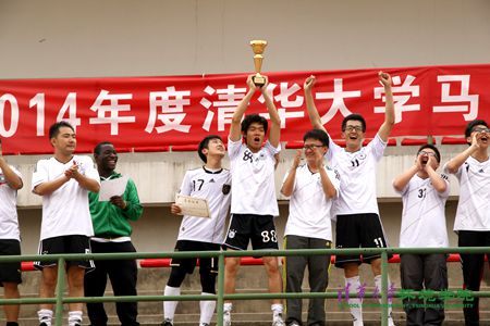 13-14赛季,文承龙,梅硕回归,喀麦隆职工威利入队,小组赛3:0战胜美院,1:0战胜核研院,1:0战胜生院,以小组第一出线。淘汰赛第一场5:1战胜电机强势挺进四强,然后3:1战胜电子挺进决赛,与航院决战东操之巅,以1:0力克对手,四年内三次夺冠。