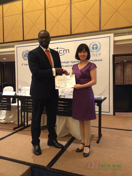 图为SAICM秘书处项目官员Muhammed Omotola先生向陈源博士授奖 葛海虹摄