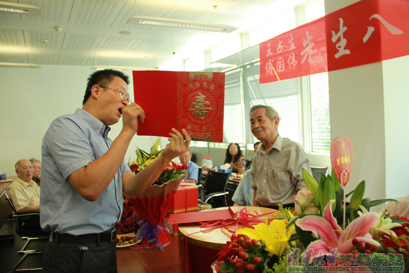 图为杜鹏飞书记向傅国伟教授赠送贺卡。