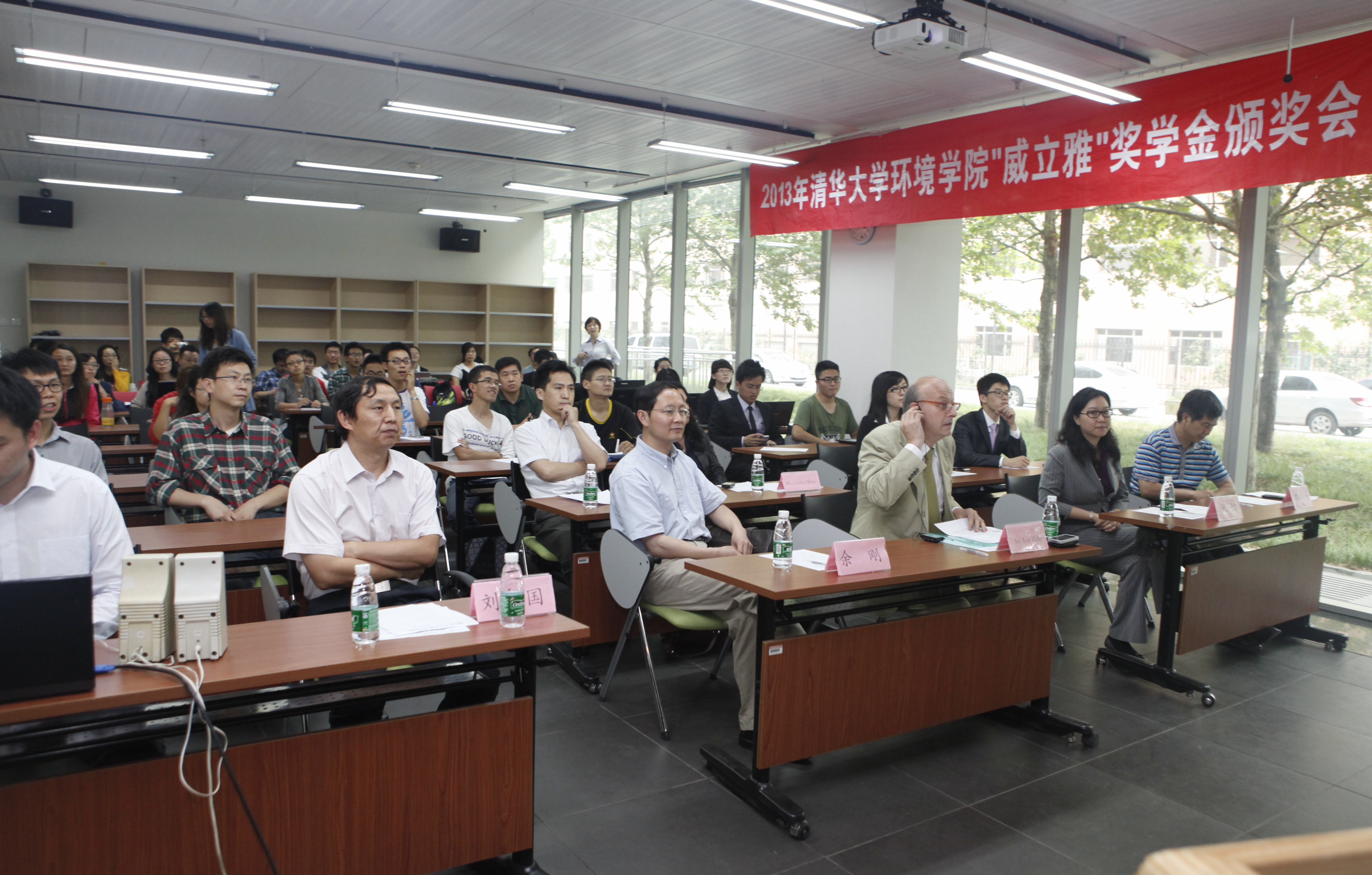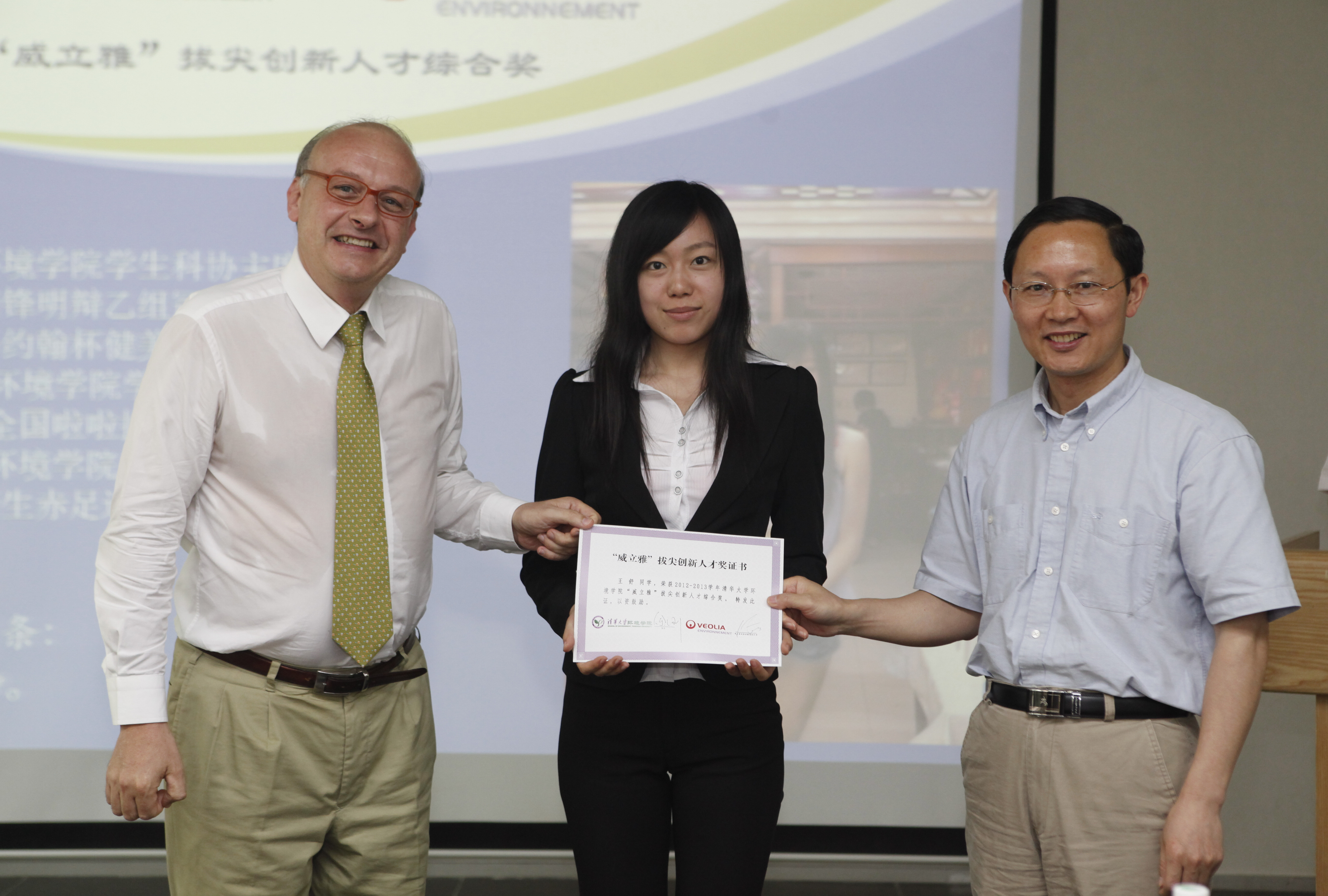 左律克先生和余刚教授分别进行了致辞,向获奖的同学表示祝贺,并共同为获得2012-2013学年“威立雅”拔尖创新人才综合奖的同学现场颁发了获奖证书。