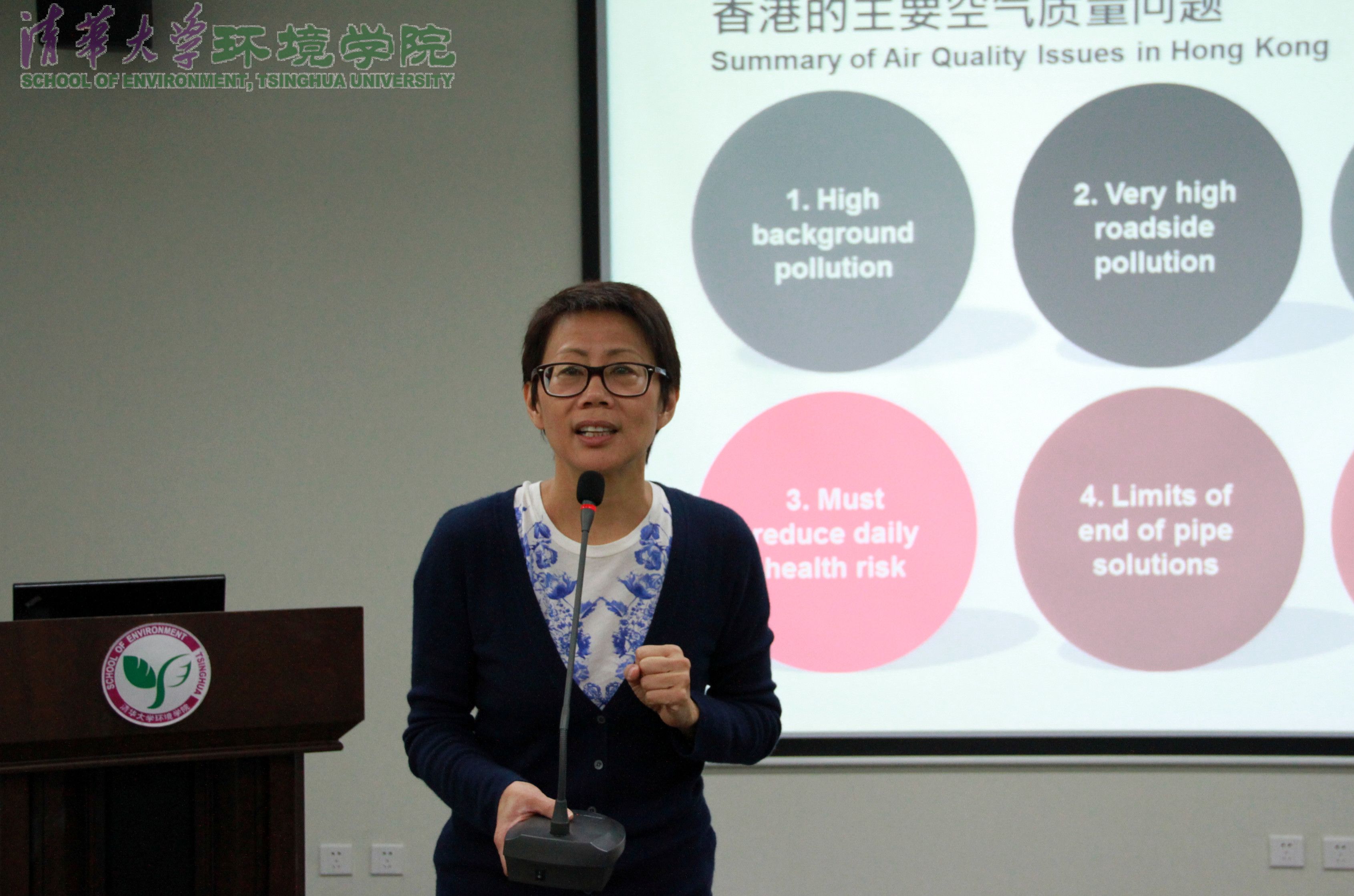 随后,陆恭蕙女士进一步介绍了香港政府处理本地污染的经验,包括控制污染源,加强政府内部各相关部门的积极合作以及香港与其他地区的合作。香港地区政府一直致力于实现如何从科学过渡到实际决策。在科学了解地区污染特性后,政府部门才能明智的决策。因此,与环境方面的专家合作是作决策之前的重要步骤。目前,香港二氧化碳排放量最高的为船舶而非燃煤电厂。在科学认识船舶污染的严重性后,地区政府做出了相应的控制策略,如过往船舶换用干净的燃油等。