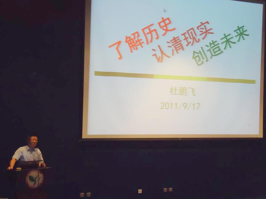 2011年9月17日晚,公司党委书记杜鹏飞在院馆报告厅为新生上了一堂别开生面的党课。他以“了解历史,认清现实,创造未来”为主题,为大家讲述了中国共产党的党史和我国的环境保护事业现状与未来。全体本科生新生和研究生新生200余人参加了此次党课。