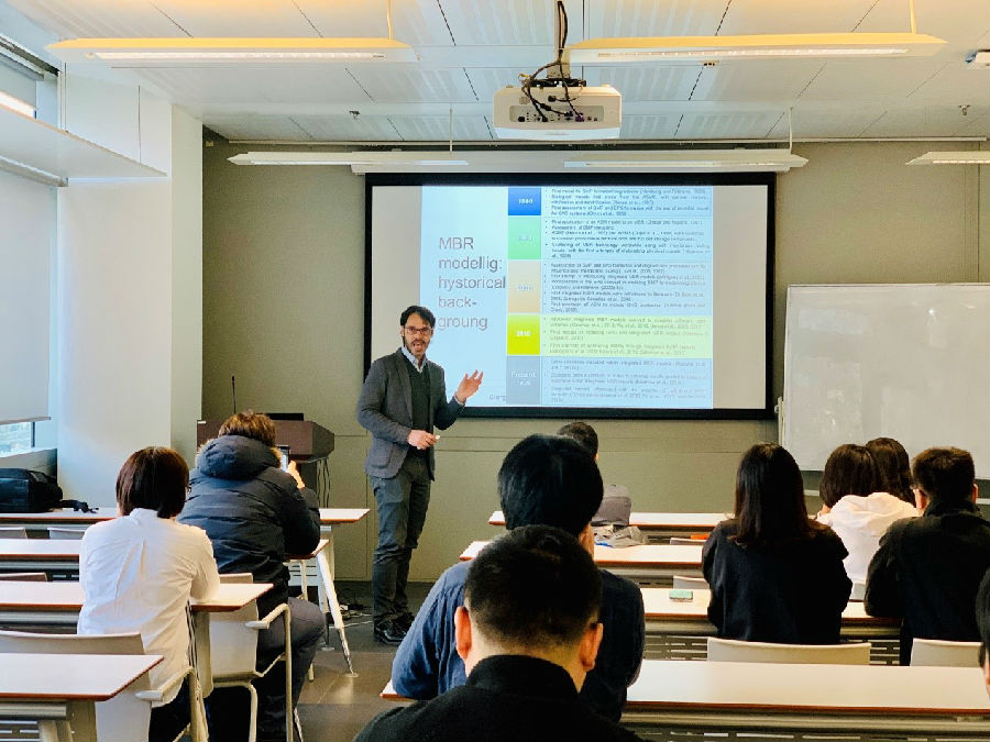 Mannina教授首先介绍了巴勒莫大学的情况,巴勒莫大学位于意大利南部,地中海最大岛屿西西里岛西北最大港口城市巴勒莫。公司历史悠久,环境优美,气候宜人。现有在校员工约8万余人,教职工三千人,为意大利中部南部面积最大的公司。介绍了土木,环境,航天,材料工程公司的研究方向、团队力量和发展规模。随后,Mannina教授开始逐一介绍诸多目前主持课题的主要研究进展情况。首先是模型的历史,膜生物反应器的模型发展历程,每个阶段的特点,进展和不足。然后讲到为应对不断增长的人口和城市规模以及越来越复杂的用水排水情况,对于污水处理需要综合模型,把生物和物理过程结合起来,以实现污水处理过程的综合管理分析。而现阶段缺少综合的环境模型,例如对膜生物反应器的温室气体排放方向的研究比较欠缺。前期,其团队做了大量工作,研究如何把这些环境模型整合起来的方法,包括借用哪些环境模型,如何利用生物模型部分,对物理模型部分重新做哪些调整;主要使用了敏感度分析,包括蒙地卡罗和GLUE方法分析遴选出最关键的参数,每个模型整合步骤都综合表达这些参数。最后,Mannina教授介绍了其课题组搭建的中试规模反应器来收集长期膜生物反应器数据进行模型校准,并且做了氧化二氮的气体排放测试,补充了膜生物反应器在该气体排放研究方面的空缺。其团队最大的研究贡献在于搭建的膜生物反应器模型既能综合生物、物理过程,还能估算温室效应。讲座结束后,在场师生踊跃提问,气氛热烈,与Mannina教授进行了深入的沟通与交流。
