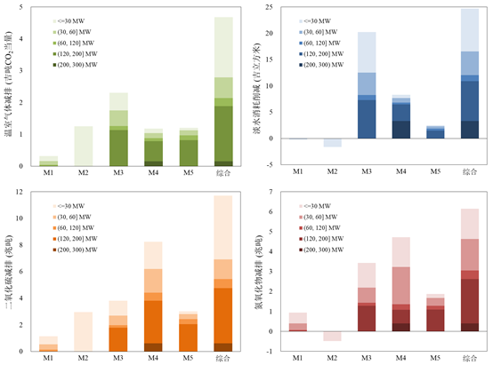 进一步地,本研究构建了能源基础设施温室气体减排“年份-存量”综合评价模型,建立了在役设施与减排技术途径的优选匹配方法,揭示了不同减排技术情景及能效提升目标下,园区能源基础设施的温室气体减排潜力、减排成本和协同环境效益。2014年,1604家中国省级及以上园区能源基础设施的温室气体排放、淡水消耗、二氧化硫排放和氮氧化物排放分别占同年全国总量的18%、5%、12%和15%。基准情景下,园区能源基础设施存量在其剩余服役时间(平均跨度为2015~2032年)的累积温室气体排放为462亿吨CO2当量,相当于政府间气候变化专门委员会《全球升温1.5℃特别报告》中全球碳预算的11%。综合情景下将M1-M5进行组合实施,相比基准情景可实现温室气体减排8~16%,并可协同节水、减排二氧化硫和氮氧化物34~39%、24%~31%和10%~14%;同时,减排具有一定经济效益,综合情景下单位减排成本为-519元/吨CO2当量(2015年可比价)。