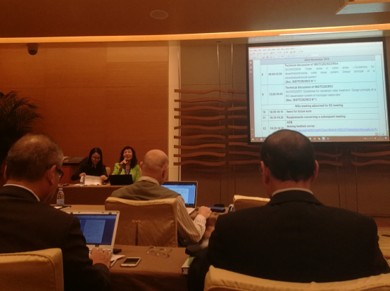 ISO/TC282城镇水回用分委员会主席胡洪营报告了城镇水回用分技术委员会(SC2)的工作进展和后续工作计划。巫寅虎介绍了新工作项目提案《Water Reuse in Urban Areas —Guidelines for reclaimed water treatment: Design principle of a RO desalination system of municipal wastewater (城镇水回用污水再生处理反渗透脱盐系统设计)》(ISO/NP 23070)的意见征询结果、修改意见和修改后的提案。陈卓介绍了新工作项目提案《Water Reuse in Urban Areas —Guidelines for decentralized/onsite water reuse system: Design principle of a decentralized/onsite system (城镇分散式水回用系统设计)》(ISO/NP 23056)的意见征询结果、修改意见和修改后的提案。中国团队所做工作得到了各成员国与会代表的充分肯定和支持,有效地推进了相关工作进程。会议同意通过两项指南草案,正式进入委员会草案阶段(Committee Draft, stage 30.00),并计划对两项草案开展为期两个月的投票。