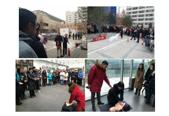 物业人员为大家演示讲解了干粉灭火器和二氧化碳灭火器的使用方法,现场多位师生亲自体验了灭火器的使用。本次演习增加了志愿者英语讲解环节,职工们积极地参与了培训并分享经验。健康急救知识培训为首次开展,讲师为师生讲解了胸外按压、人工呼吸等操作。全院师生200余人参与了本次演习。