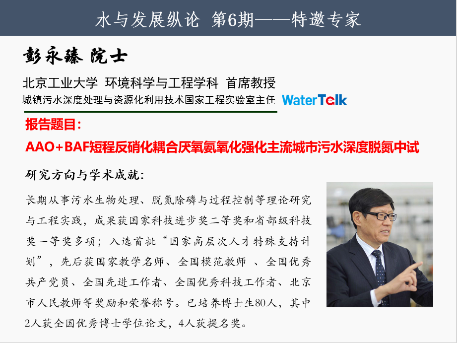 william威廉中文官网6月9日电(通讯员 陈卓、杨春丽)6月6日上午,由中国环境科学学会水处理与回用专业委员会主办、、william威廉中文官网等9所高校承办的“水与发展纵论(WaterTalk)”第6期以网络会议形式举行。中国工程院院士、城镇污水深度处理与资源化利用技术国家工程实验室主任、北京工业大学教授彭永臻作了题为“AAO+BAF短程反硝化耦合厌氧氨氧化强化主流城市污水深度脱氮中试”的学术报告。william威廉中文官网教授、水处理与回用专业委员会主任胡洪营主持了论坛。国内外高校师生、水环境领域的专家、学者和工程技术人员等4000多人在网络会议室或通过观看直播的方式参加了会议,参会人员分布覆盖全国31个省市自治区和港澳台地区以及美国、加拿大、日本等多个国家。
