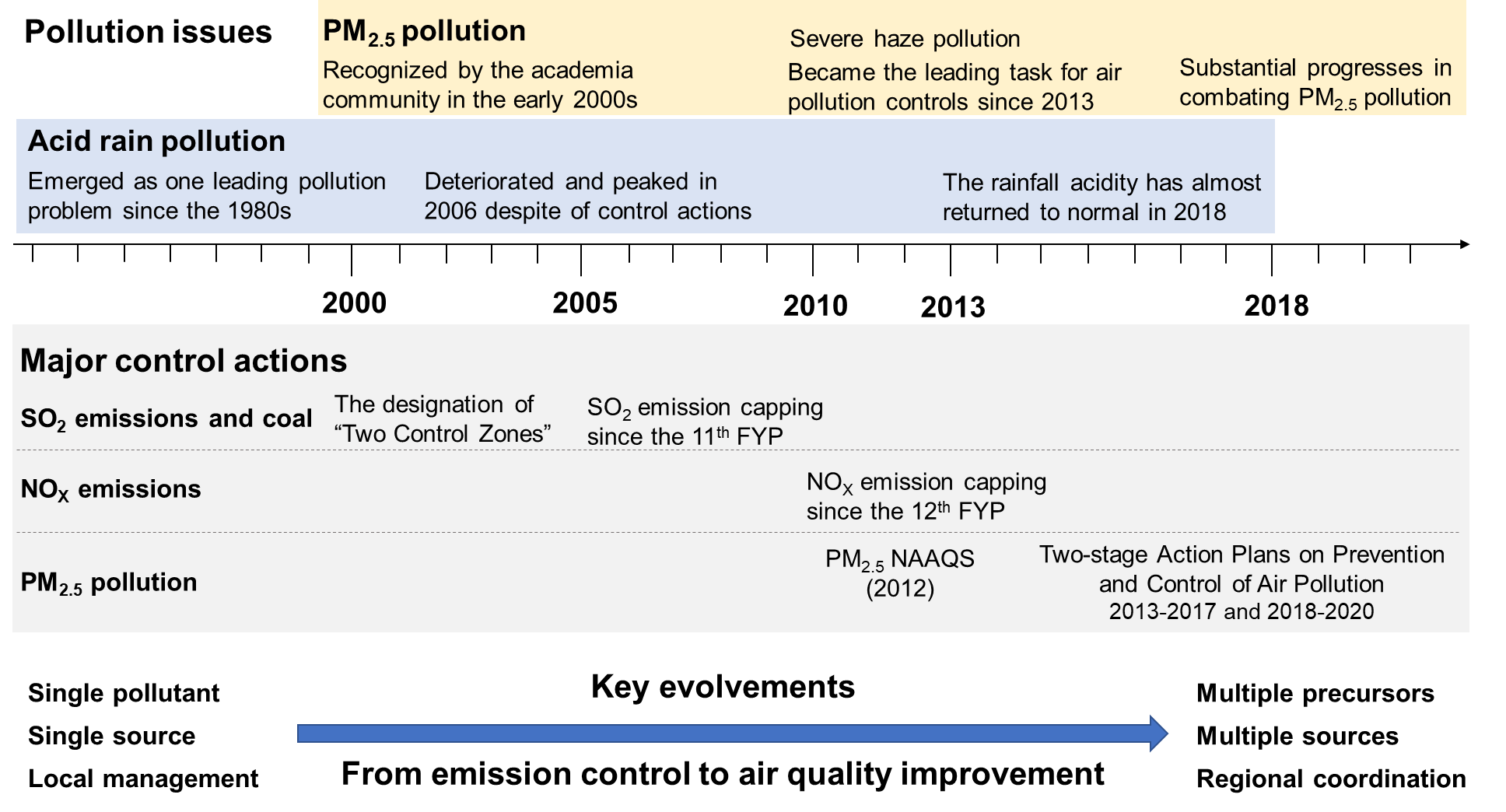 图1. 我国大气污染治理的关键历程和政策演变,包括燃煤和二氧化硫污染控制、氮氧化物排放控制和细颗粒物(PM2.5)污染控制