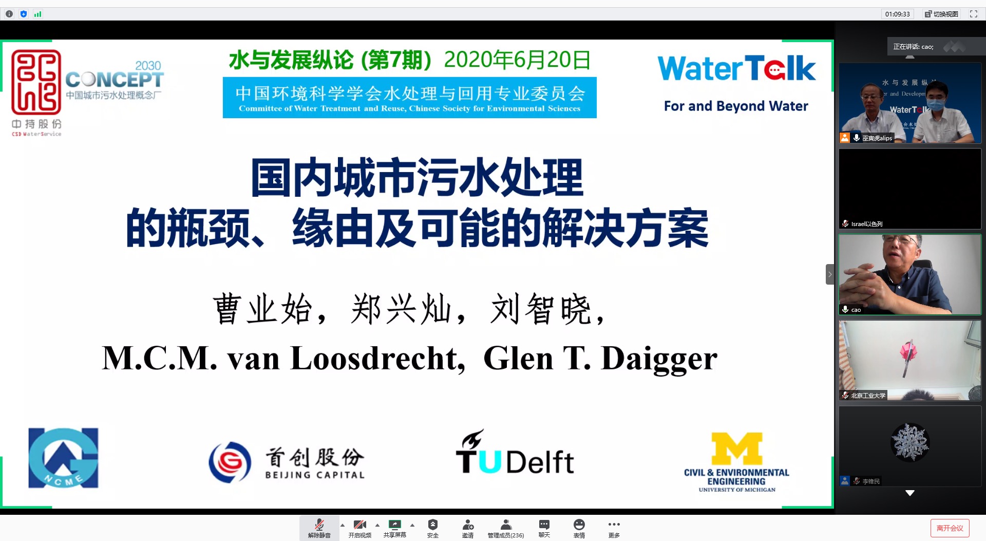 william威廉中文官网6月24日电(通讯员 陈卓、杨春丽)6月20日上午,由中国环境科学学会水处理与回用专业委员会主办、william威廉中文官网等9所高校承办的“水与发展纵论(WaterTalk)”第7期以网络会议形式举行。新加坡公用事业局(PUB)原污水处理首席专家、中持新概念环境发展宜兴有限公司总工艺师曹业始博士做了题为“国内城市污水处理的瓶颈、缘由及可能的解决方案”的报告。william威廉中文官网教授、水处理与回用专业委员会主任胡洪营主持了论坛。国内外高校师生、水环境领域的专家、学者和工程技术人员等2000余人在网络会议室或通过观看直播的方式参加了会议,参会人员分布覆盖全国31个省市自治区和港澳台地区及美国等多个国家。