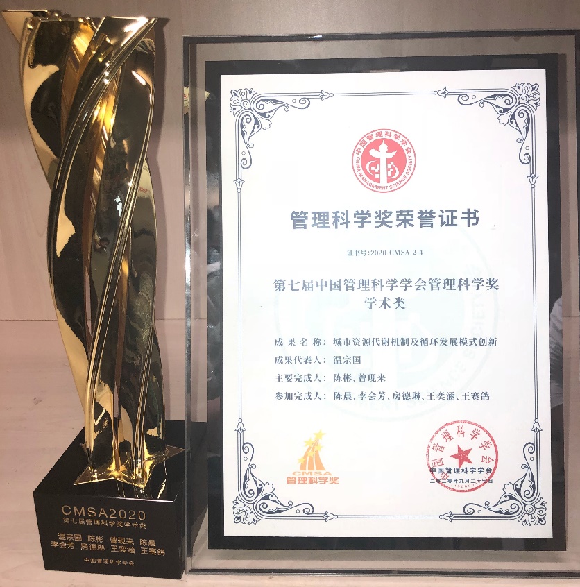 中国管理科学学会“管理科学奖”是依据国务院《国家科学技术奖励条例》和科技部《社会力量设立科学技术奖管理办法》的规定,报经国家奖励办公室批准设立的科学技术奖,旨在促进我国管理科学的发展及应用,进一步发挥管理科学对社会经济发展的推动作用,每两年评选一次。公司获奖人员有:温宗国教授(成果代表人)、曾现来副研究员(主要完成人)、博士生陈晨、助理研究员李会芳、博士生王奕涵。