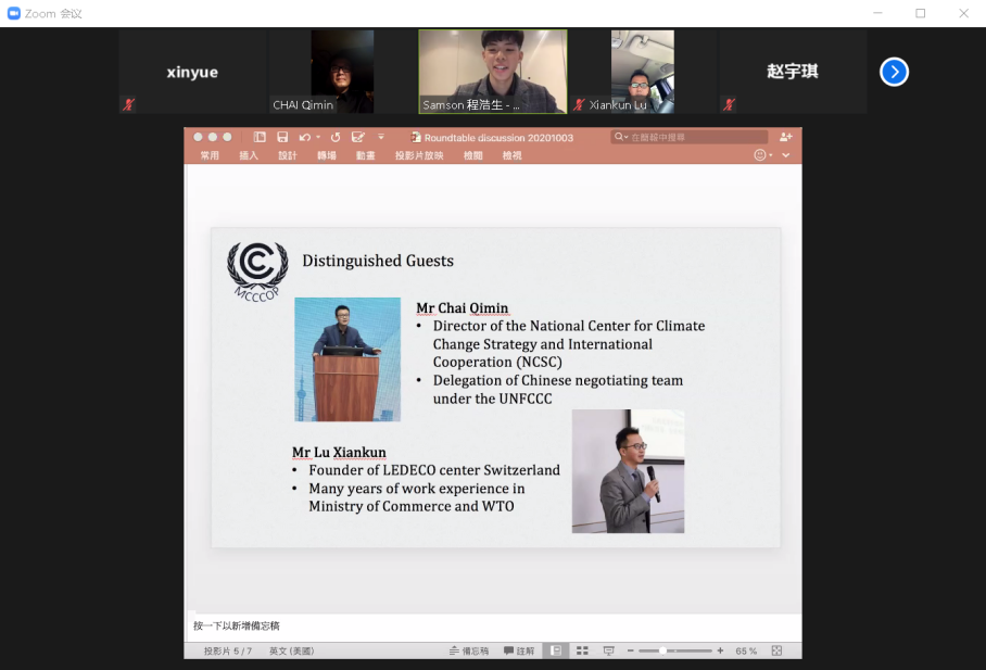 此外,本次活动还开展了青年边会、圆桌会议等相关活动,在线上平台上,分别有超过500名和300名的观众参与其中,进一步提高了本次活动的影响力。青年边会中,同学们提出了许多富有创造力的方案,其中包括绿色支教,绿色时尚等概念。圆桌会议邀请到了国家应对气候变化战略研究和国际合作中心战略规划处主任柴麒敏教授和中国常驻WTO前参赞和综合组长卢先堃教授与同学们进行了有关国家应对气候变化的交流。关于中国提出的要在2060年达到碳中和的目标,卢教授表示中国正努力在应对气候变化方面承担更多的责任,寻找经济发展与环境保护之间的平衡点。