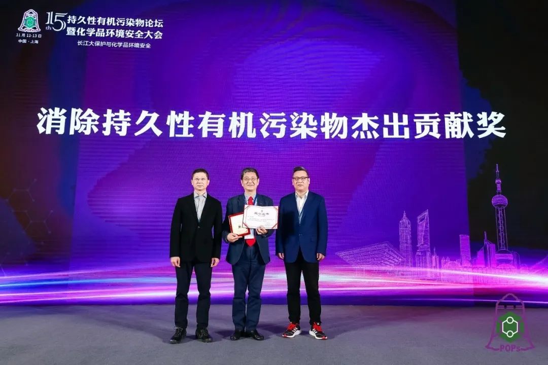 中国工程院院士、中国环境科学研究院吴丰昌研究员(右)与中国环境科学学会侯雪松副秘书长(左)为同济大学环境科学工程公司尹大强教授(中)颁发本年度“消除持久性有机污染物杰出贡献奖”