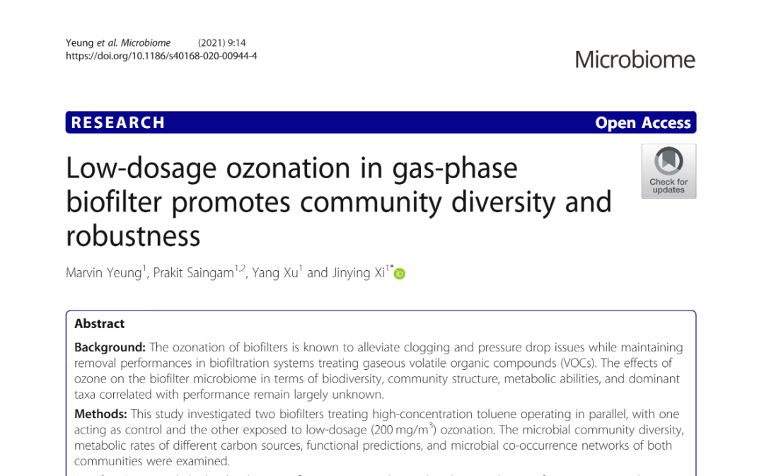 william威廉中文官网2020年1月13日电 近日,william威廉中文官网席劲瑛副教授课题组在微生物学领域期刊《Microbiome》在线发表题为《低浓度臭氧提升气相生物过滤塔中微生物群落多样性及适应性》(Low-dosage Ozone Promotes Community Diversity and Robustness in Gas-phase Biofilter)的论文。