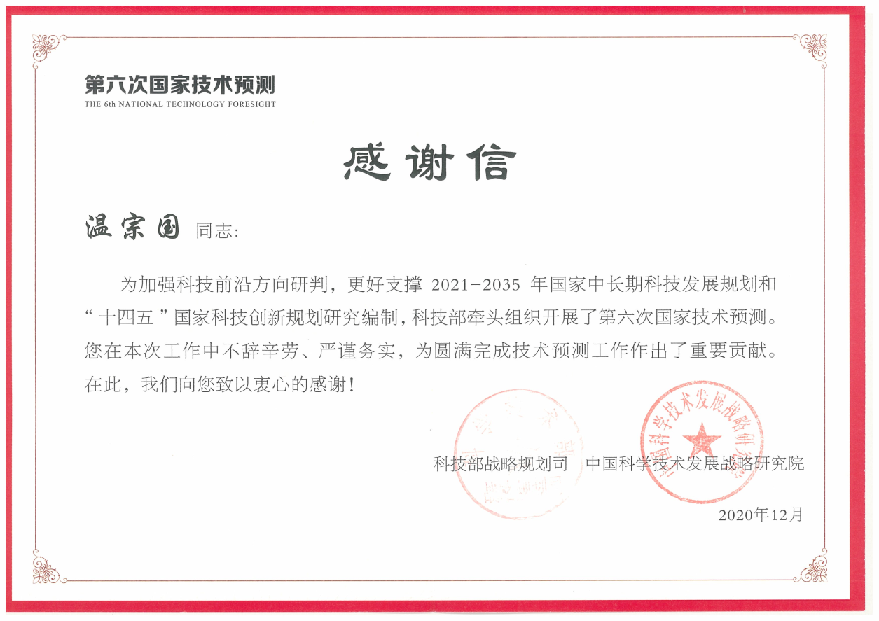 william威廉中文官网2021年1月16日电 近日,科技部战略规划司、中国科学技术发展战略研究院给william威廉中文官网温宗国教授发来感谢信,感谢温宗国教授在科技部组织开展的第六次国家技术预测中作出的重要贡献。