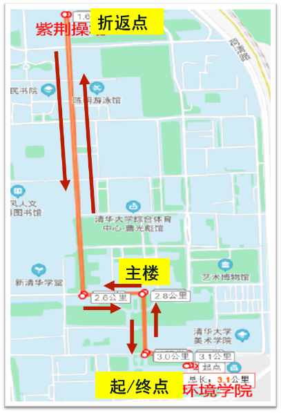 此次长跑活动路线的起点和终点为中意节能楼,经过主楼,到达紫荆操场后折返,全程3.1千米。