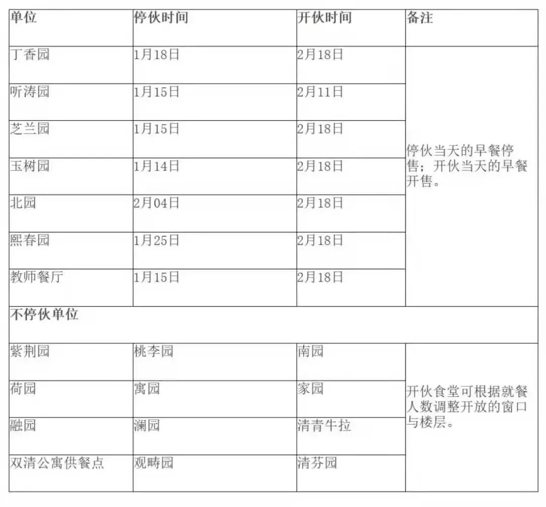 寒假食堂停开伙情况(信息来源:清华后勤)
