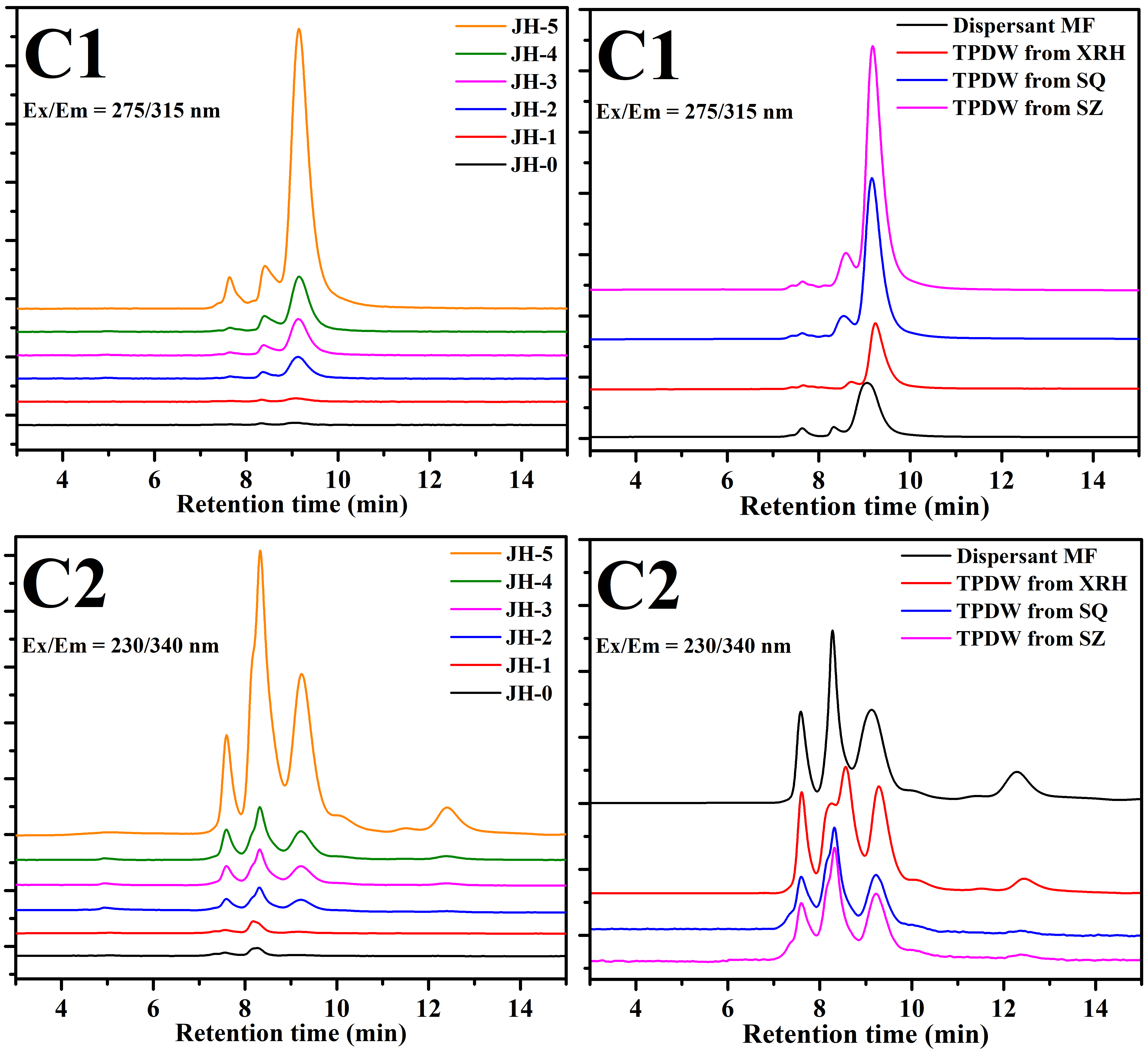 图2 特定荧光激发/发射波长对下(C1:Ex/Em = 275/315 nm; C2: Ex/Em = 230/340 nm)京杭运河苏南段水体(JH-0~JH-5)、印染废水(XRH, SQ, SZ)、分散剂MF中荧光溶解性有机物的表观分子量分布特征
