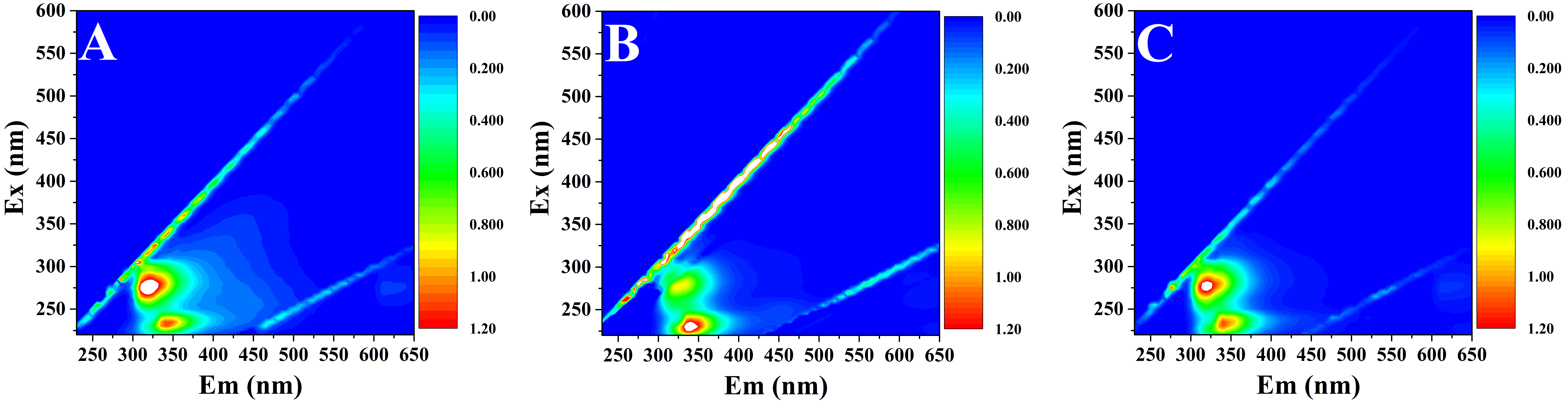 图1 京杭运河苏南段水体(A)、印染废水(B)、分散剂MF(C)的荧光指纹