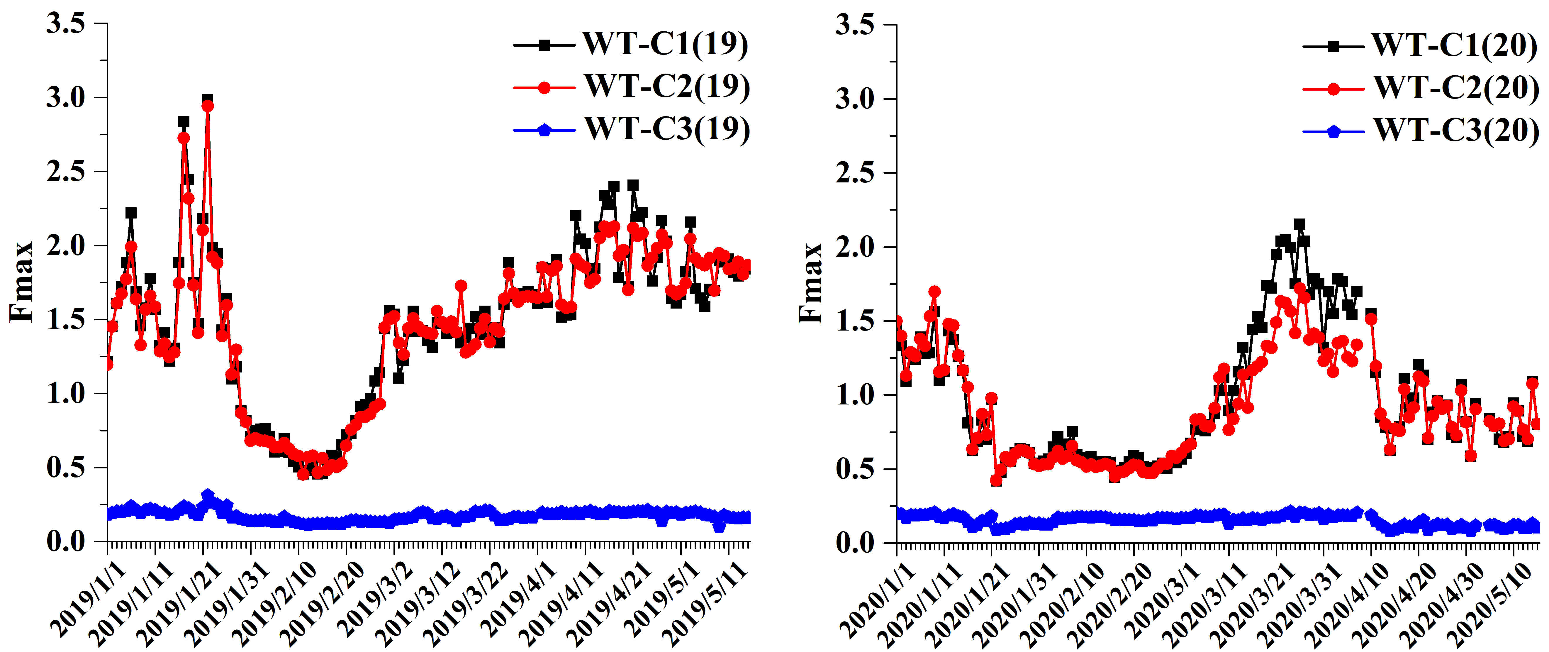 图3 2019年和2020年1月1日至5月15日期间京杭运河苏南段某监测断面水体中三个荧光组分的强度变化