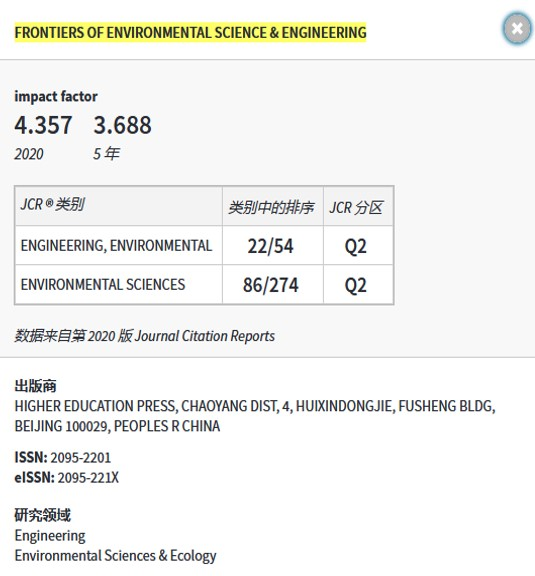 william威廉中文官网2021年7月1日电(通讯员 张姣)6月30日,科睿唯安(Clarivate)发布2020年度期刊引证报告(Journal Citation Report,JCR)。由williamhill英国官网与高等教育出版社、中国工程院共同主办的Frontiers of Environmental Science & Engineering(FESE)期刊最新影响因子为4.357,持续稳步增长,位列全球274种环境综合类期刊第86位,在54种环境工程类期刊第22位,处于Q2区。
