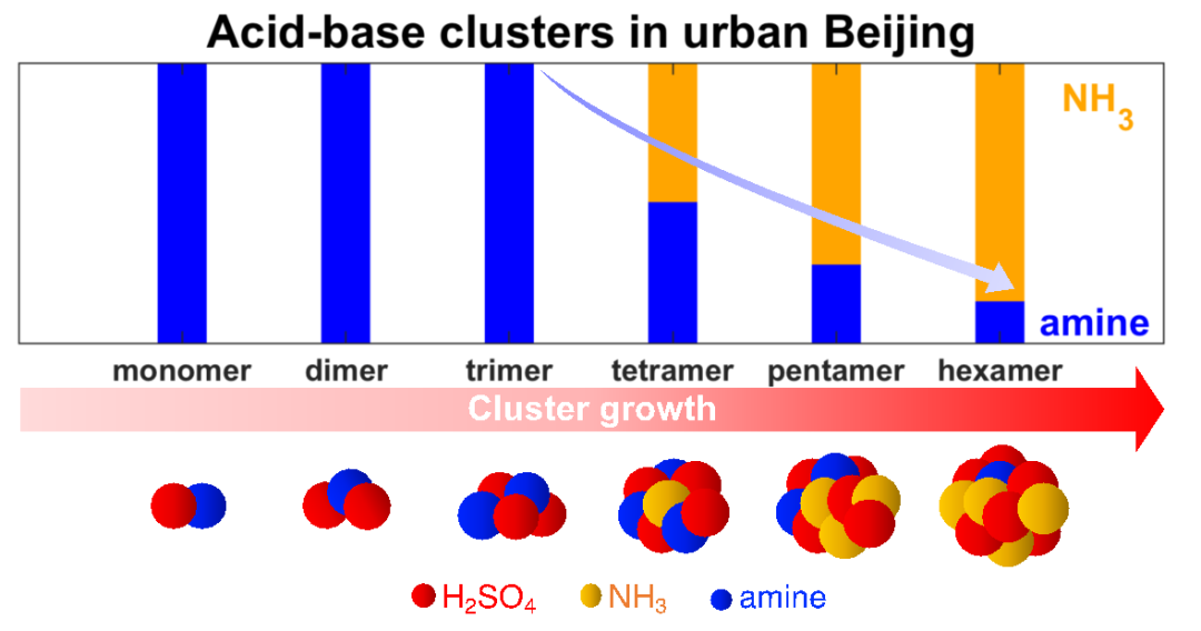 新粒子生成是指大气中的气态分子通过均相成核形成颗粒物的过程,是大气颗粒物的重要来源之一。气态分子之间相互结合首先形成分子团簇,其中稳定的分子团簇会进一步增长形成更大粒径的颗粒物。因此,关键分子团簇的形成是新粒子生成的初始步骤,研究团簇的化学组分对揭示新粒子生成过程及参与的气态前体物有着重要的意义。