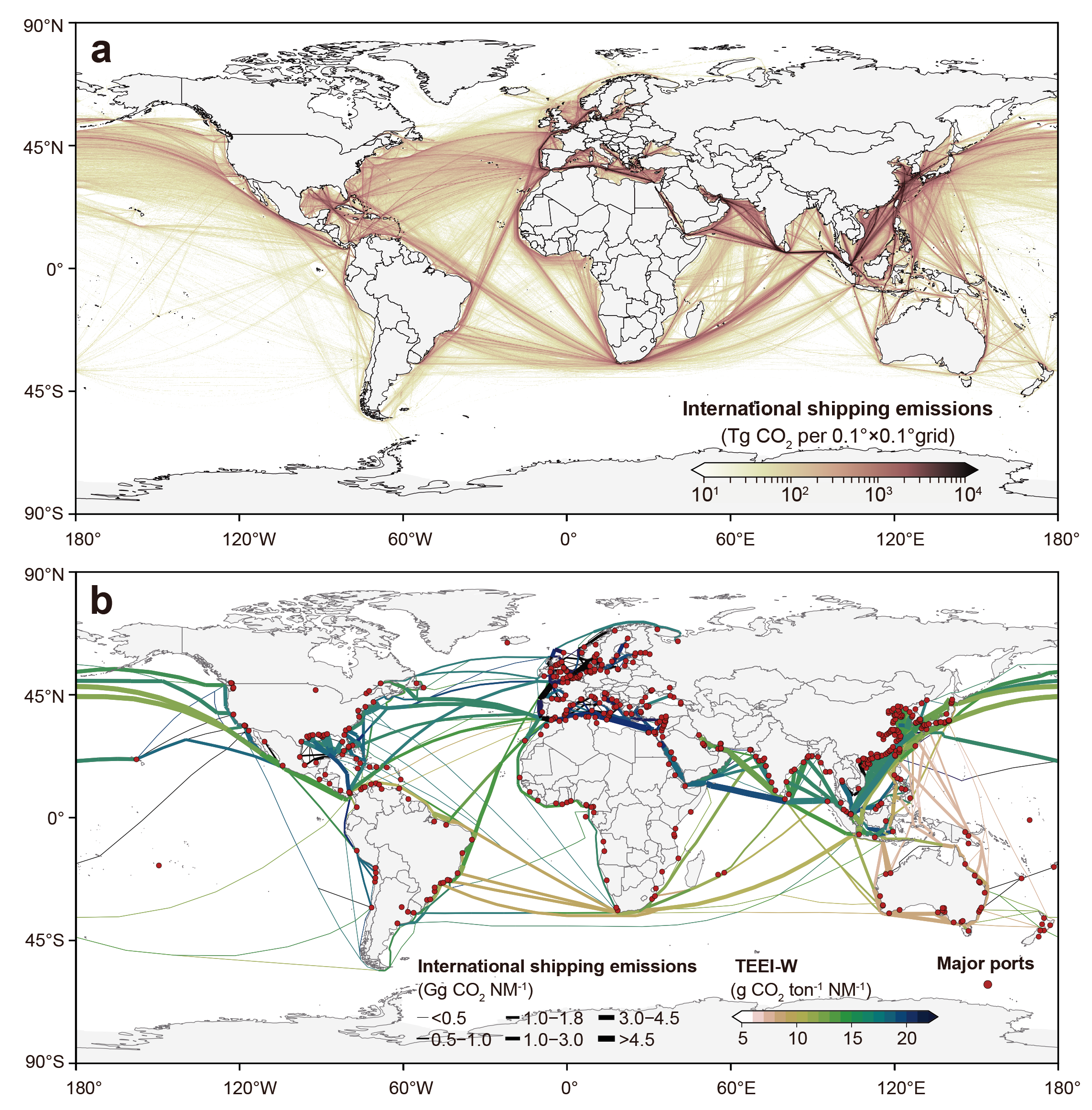 (a)基于船舶识别航程的VoySEIM模型所估算的海运CO2排放,(b)基于双边贸易流量的GTEMS模型估算的海运CO2排放。图b中船舶排放强度(单位为gCO2NM-1)表示通过各航线段的所有贸易运输船舶的累积排放量,而TEEI-W(贸易排放效率指数,单位为gCO2ton-1NM-1)表示该航线的海运排放强度与其运输的所有商品重量之比。