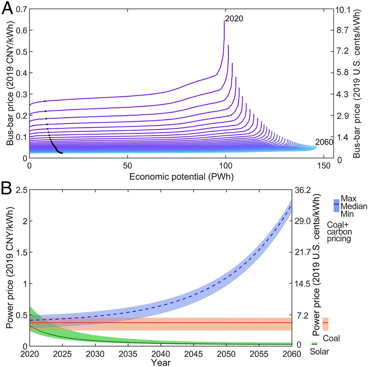 图2 光伏发电供给曲线(A)及光伏发电与煤电价格比较(B)