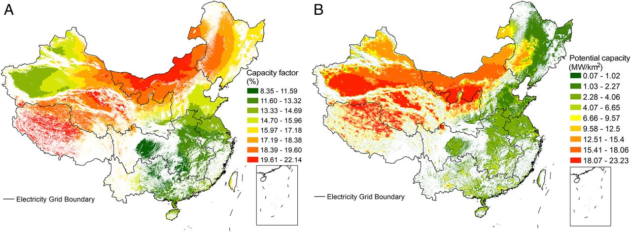 图1 光伏发电容量因子(A)及装机潜力(B)分布