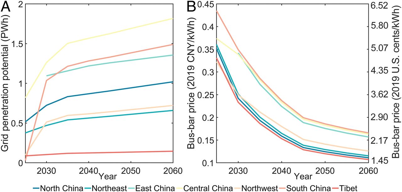 图3 “光伏+储能”并网潜力(A)及成本(B)