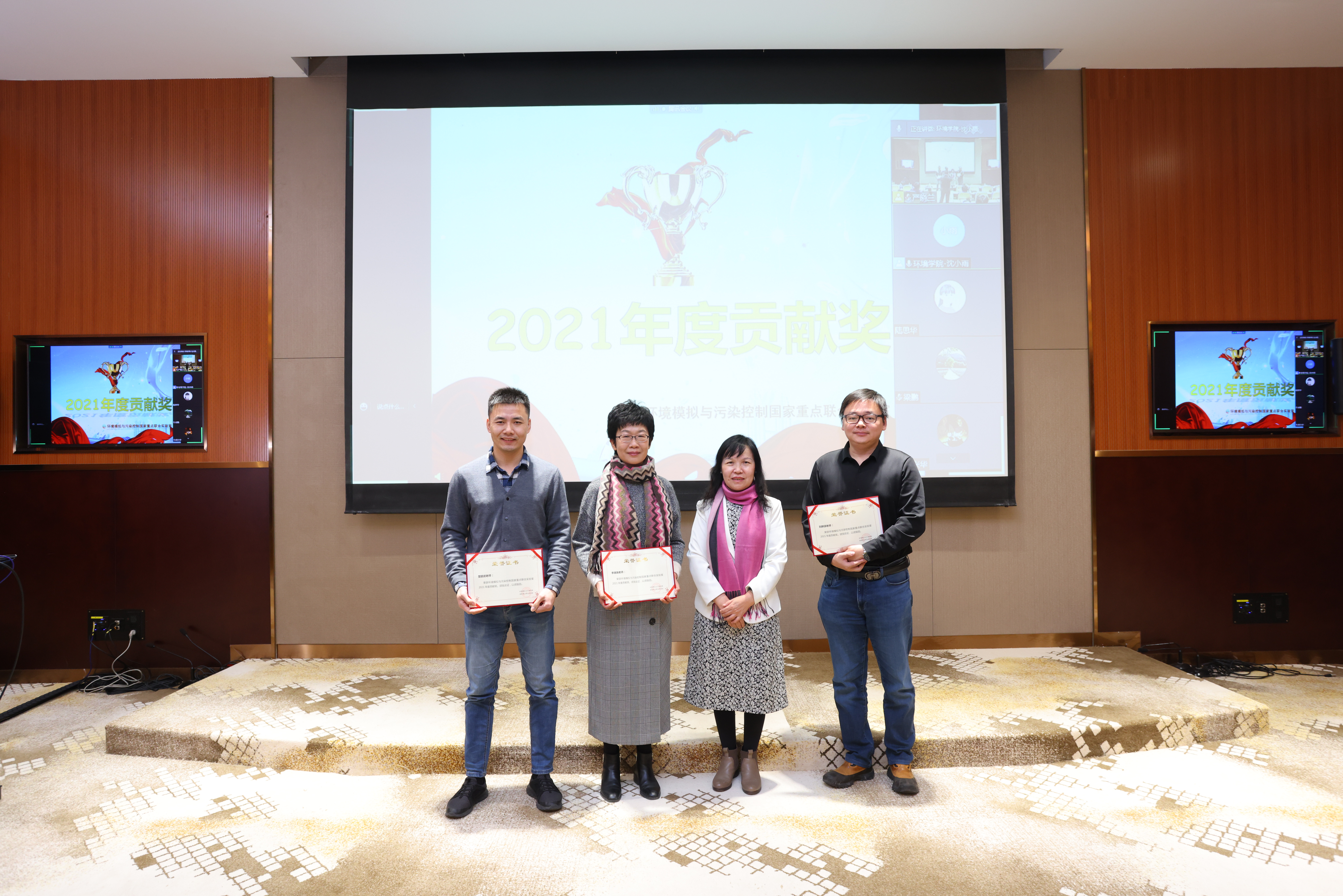 本次年会还评出了实验室2021年度贡献奖,曾立民、刘耕源、楚碧武和李瑞瑞获此殊荣。黄霞向获奖人员颁发了获奖证书。